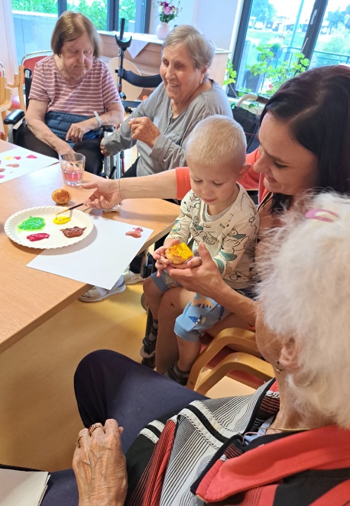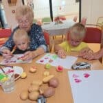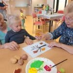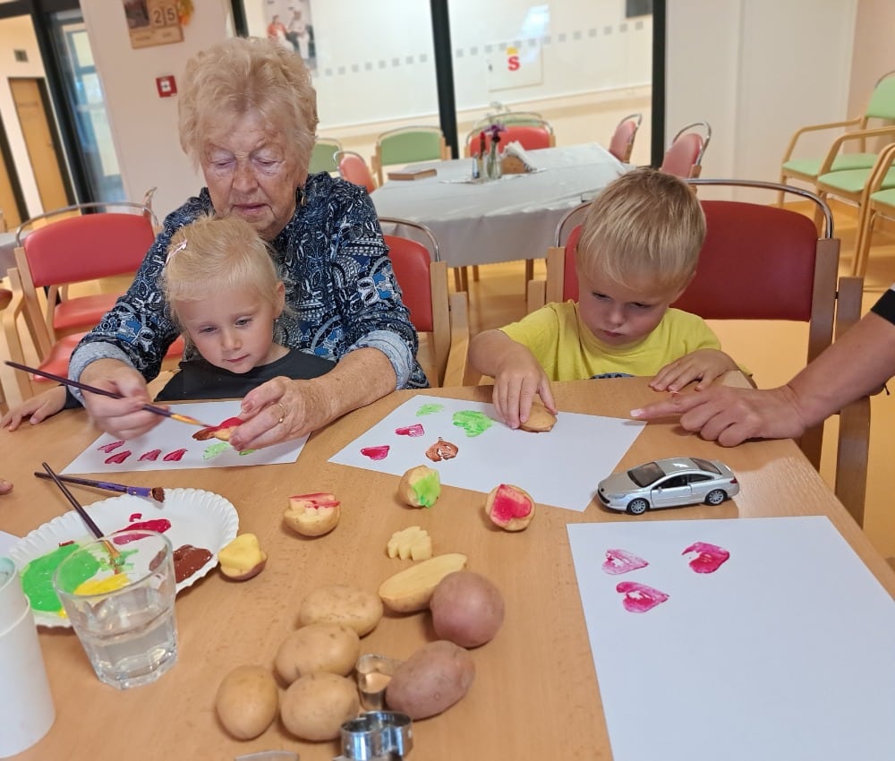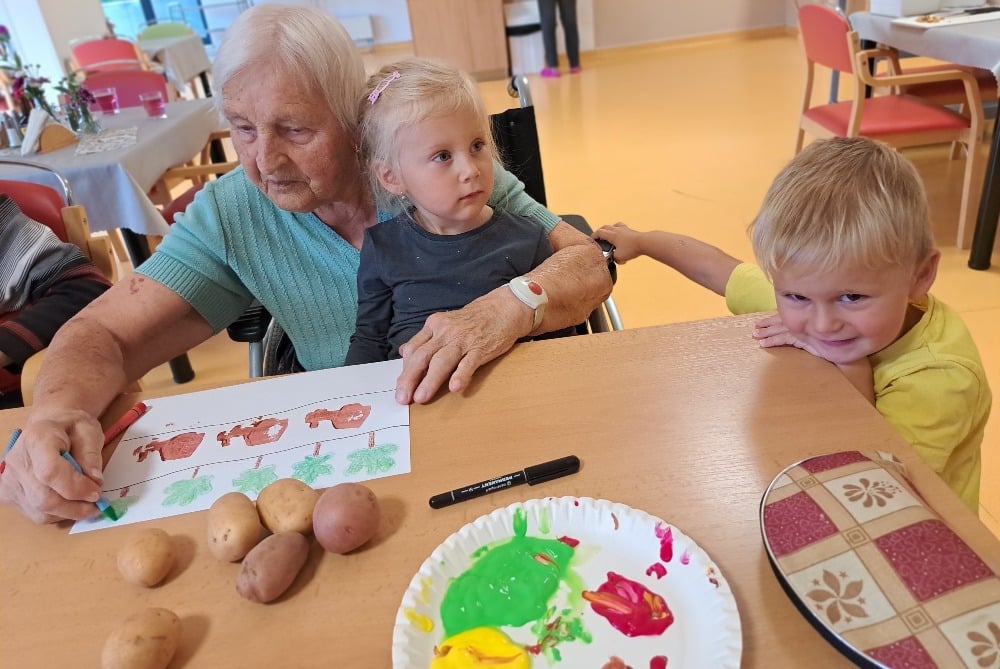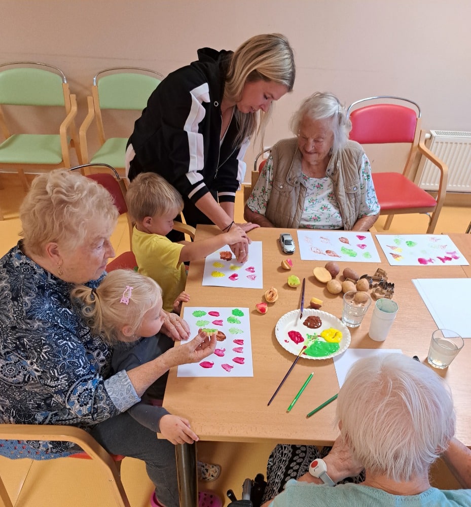 Při výtvarné aktivitě jsme se věnovali kreslení s motivy brambor a zelí. Velký úspěch mělo také kulinaření, kde si naše klientky vlastnoručně připravily domácí zelné placky – a nejen že krásně voněly, ale i výborně chutnaly! Velmi milé bylo také mezigenerační setkání s dětmi z dětské skupiny Hangárek, která sídlí přímo v areálu našeho domova. Jelikož jsou děti opravdu malé, naše šikovné dámy jim předem vyřezaly bramborová razítka, která jsme pak společně používali k tiskání na papír. Radost byla na obou stranách – děti byly nadšené a naše klientky potěšilo, jak moc je to bavilo. Podzim si u nás zpříjemňujeme nejen dobrým jídlem, ale i hezkými společnými chvílemi.