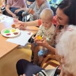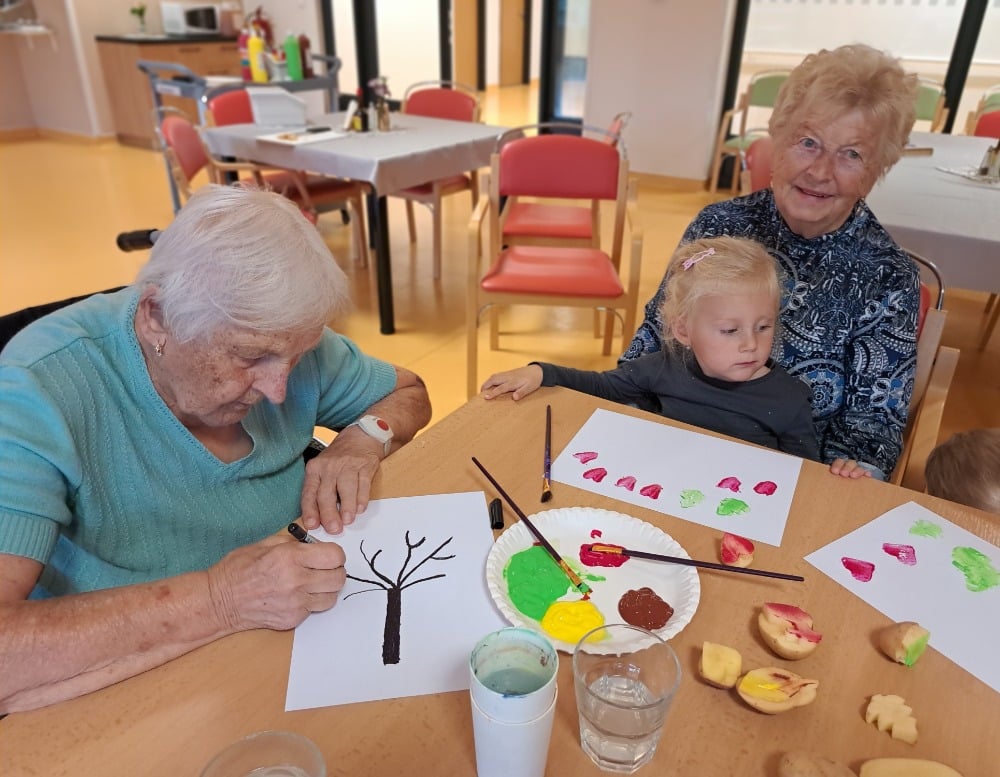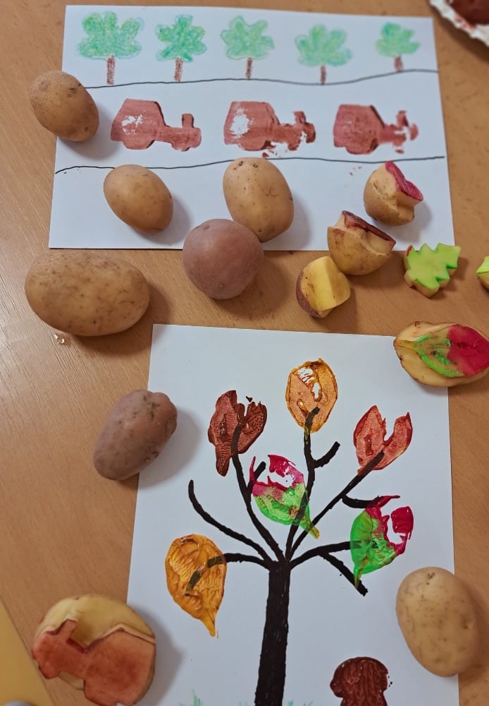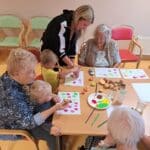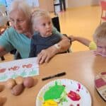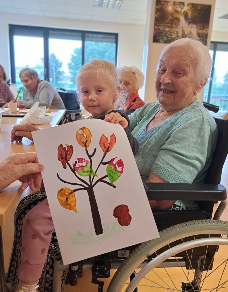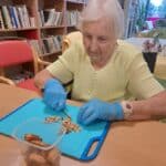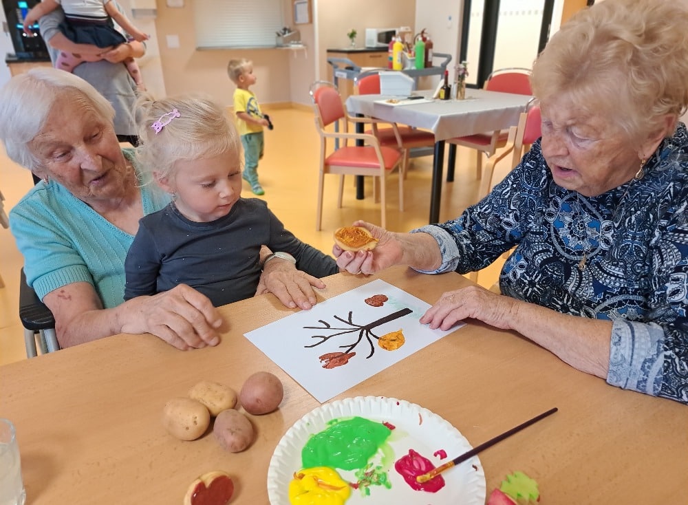 Při výtvarné aktivitě jsme se věnovali kreslení s motivy brambor a zelí. Velký úspěch mělo také kulinaření, kde si naše klientky vlastnoručně připravily domácí zelné placky – a nejen že krásně voněly, ale i výborně chutnaly! Velmi milé bylo také mezigenerační setkání s dětmi z dětské skupiny Hangárek, která sídlí přímo v areálu našeho domova. Jelikož jsou děti opravdu malé, naše šikovné dámy jim předem vyřezaly bramborová razítka, která jsme pak společně používali k tiskání na papír. Radost byla na obou stranách – děti byly nadšené a naše klientky potěšilo, jak moc je to bavilo. Podzim si u nás zpříjemňujeme nejen dobrým jídlem, ale i hezkými společnými chvílemi.